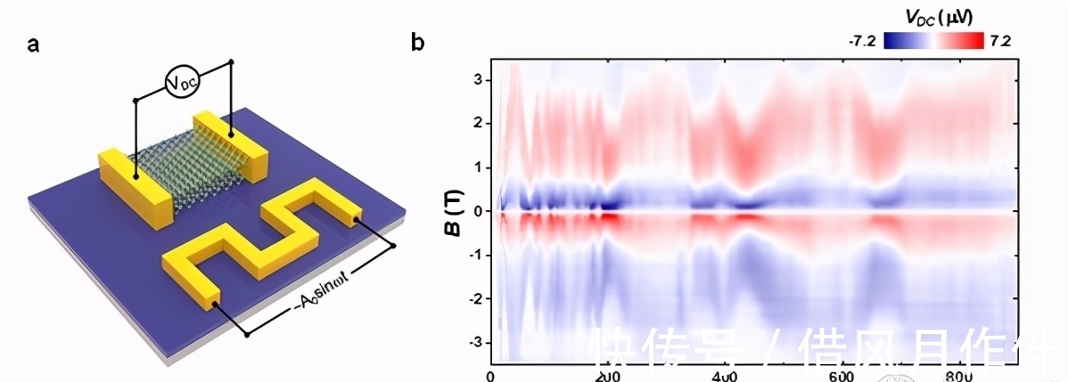 基于这种可逆电磁手性效应,修发贤课题组设计制备了纳米尺度超导二硒化铌天线器件。在超导态下,由于二硒化铌中的涡旋在外电磁场驱动下获得了净速度,器件可以实现对外界施加的电磁波的信号的非互易可逆探测:当对天线器件辐射电磁波时,器件可以稳定的产生直流电压、电流信号,并持续稳定地对外界输出能量(做功)。同时,该器件可以实现对小到1微瓦的电磁波信号的探测,器件的探测频谱宽度可达5MHz-900Mhz。