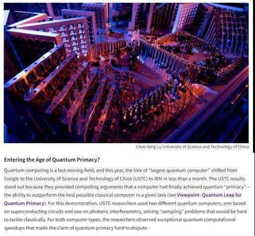 这一系列成果使我国成为目前国际上唯一同时在两种物理体系均达到“量子计算优越性”的国家。美国物理学会评价认为,中国科学技术大学研究团队在与谷歌、IBM等竞争中脱颖而出,提供了令人信服的实验论据,在他们的超导和光学量子计算机展示了卓越的量子计算优越性。
